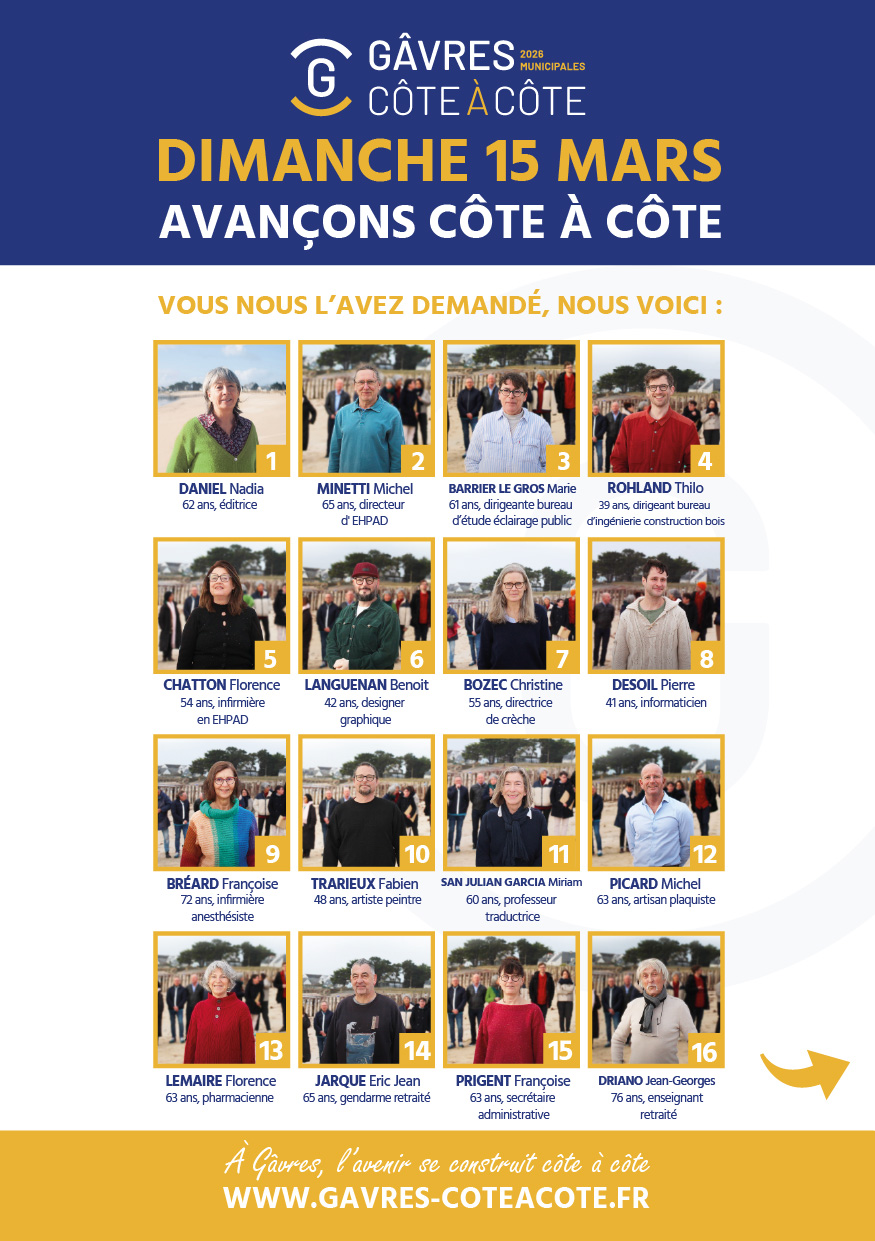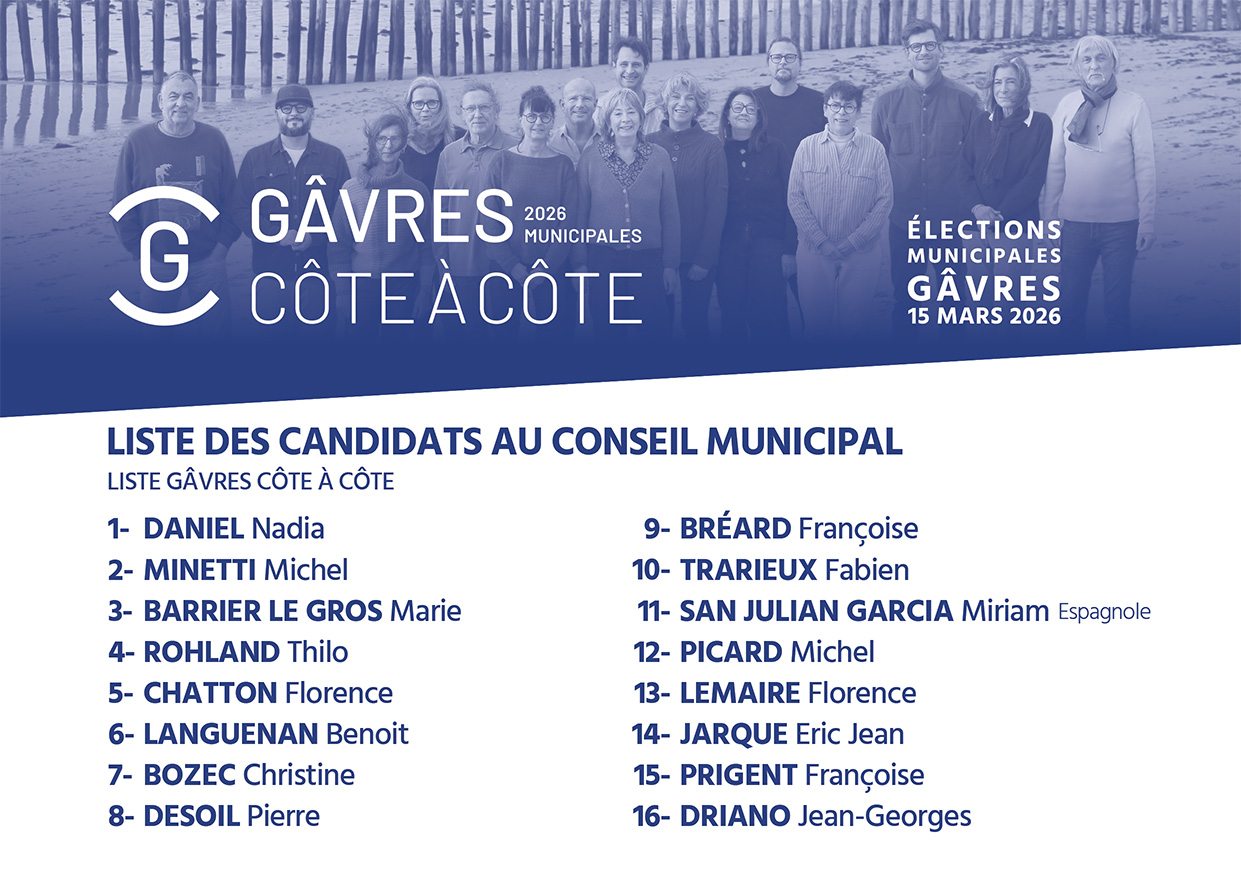 La liste « Gâvres Côte à Côte » est une liste citoyenne unie autour des valeurs de la démocratie participative, de l’écoute et du dialogue avec les Gâvrais et Gâvraises, de leurs envies, de leurs besoins, de leurs idées.