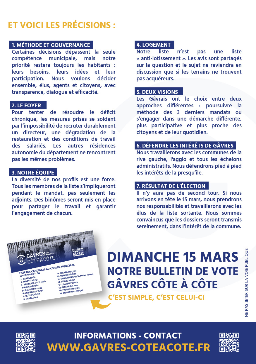 Les Gâvrais ont le choix entre deux approches différentes : poursuivre la méthode des 3 derniers mandats ou s’engager dans une démarche différente, plus participative et plus proche des citoyens et de leur quotidien.