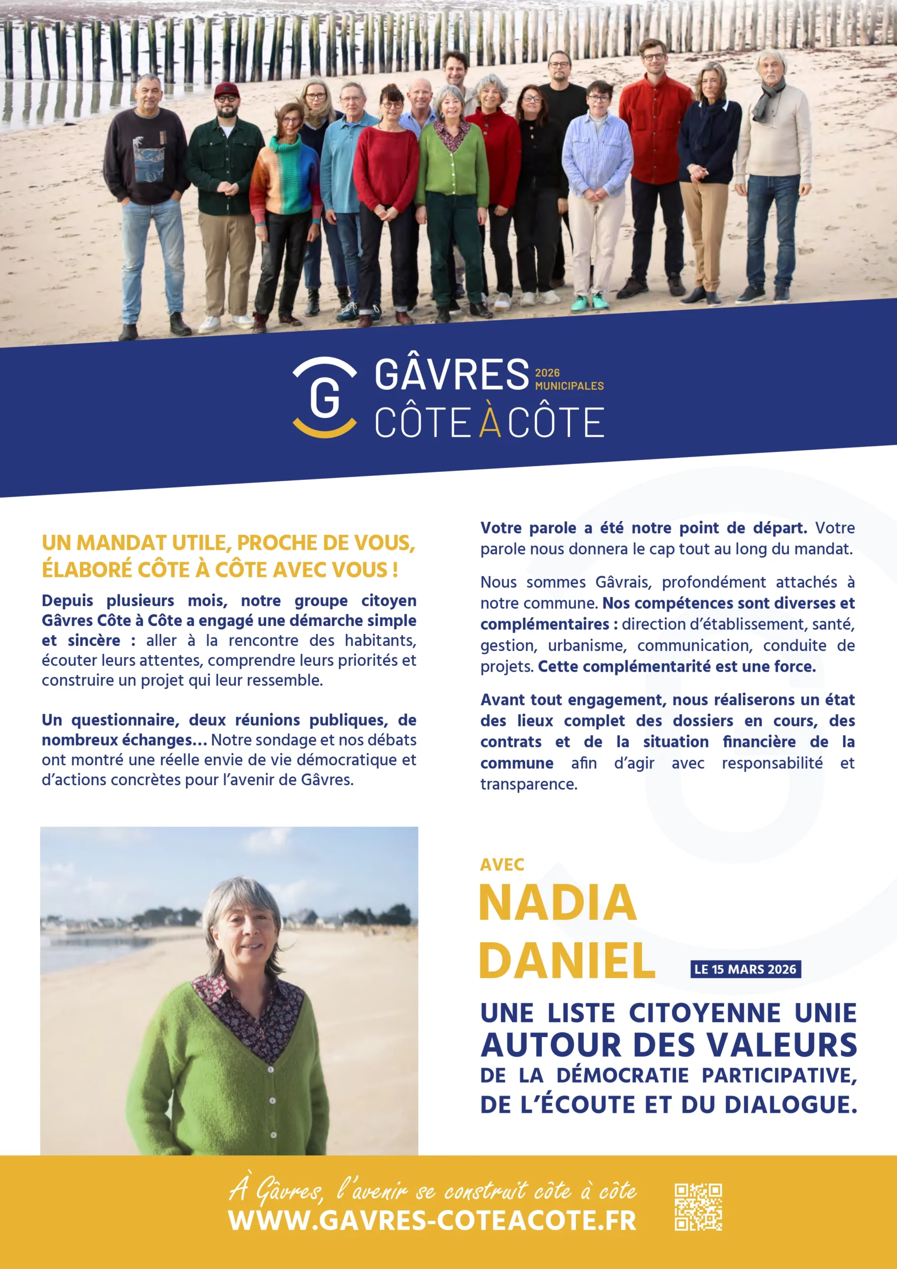 Conduite par Nadia DANIEL, la liste Gâvres Côte à Côte s’appuie sur un groupe citoyen solide et motivé, riche de compétences diverses et complémentaires.