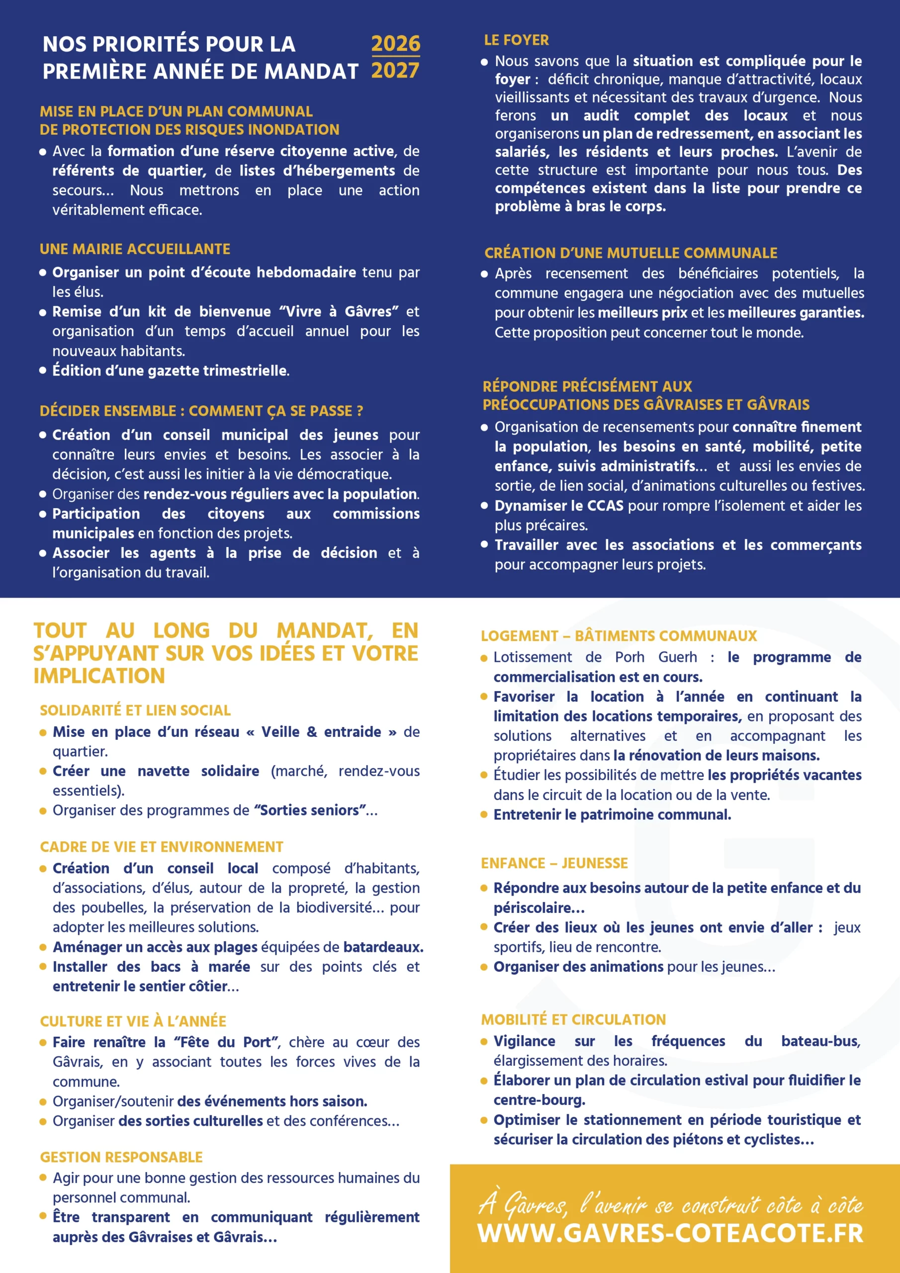 Le groupe travaille de façon collégiale depuis plusieurs mois pour élaborer son programme. Un programme orienté vers le renforcement du lien social, de la solidarité, de la confiance mutuelle qui doit exister entre les citoyens et les élus. Un programme pour que Gâvres vive toute l’année, en appuyant l’action des associations, des commerçants, en favorisant la culture et les animations, en travaillant sur la prévention des risques. Tout en préservant la singularité et la beauté de la presqu’île.